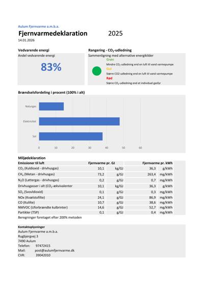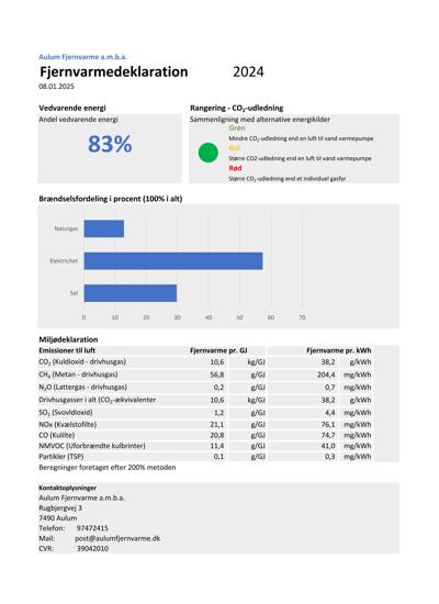 Herunder findes fjernvarmedeklarationer der viser brændselsfordeling, miljødeklaration og andel af vedvarende energi.